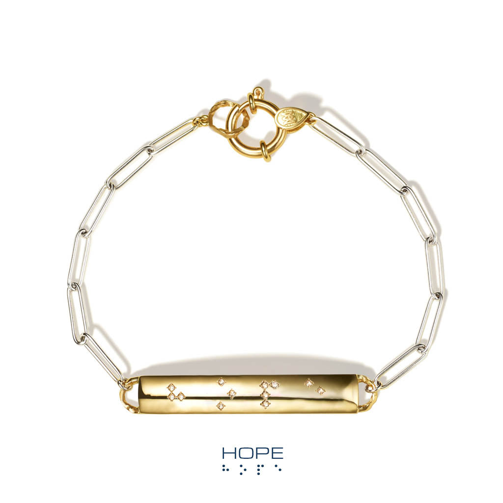 This piece spells ‘Hope’ in Braille, written in diamonds on solid 18K yellow gold. Suspended from an 18K white gold paperclip chain and secured with our signature pocket-watch clasp, it offers a timeless design and a subtle way to express what matters most.