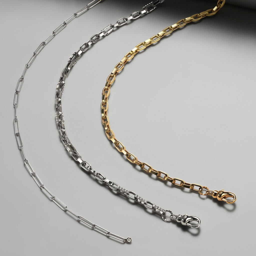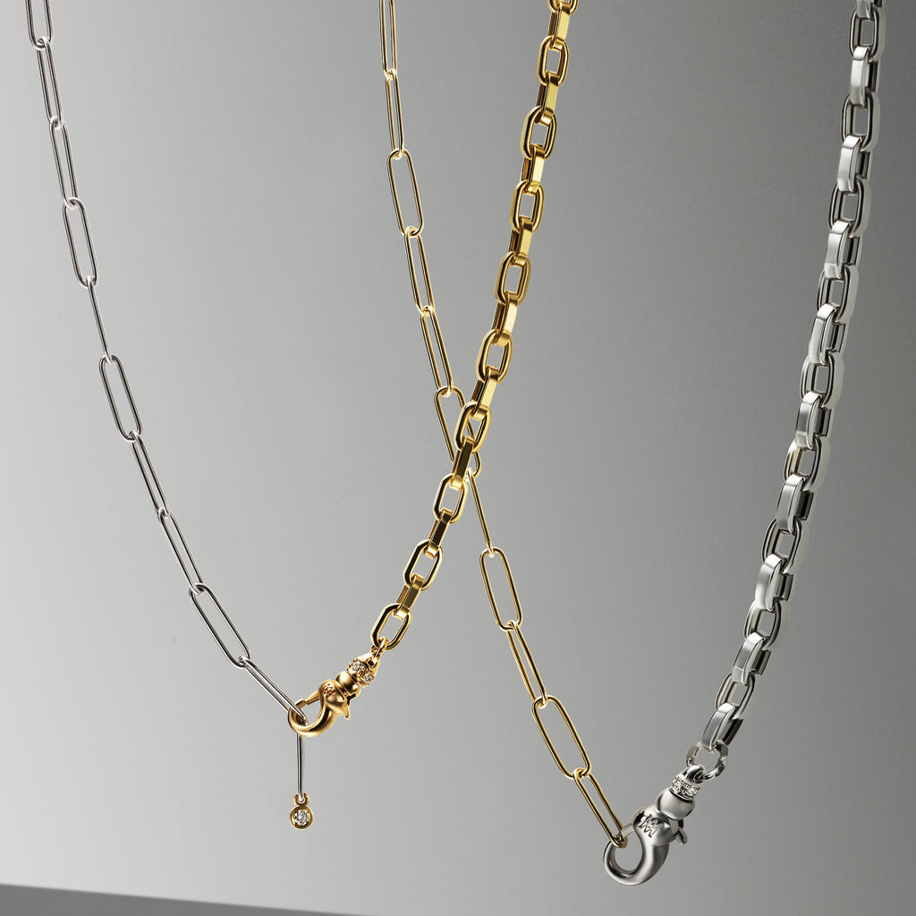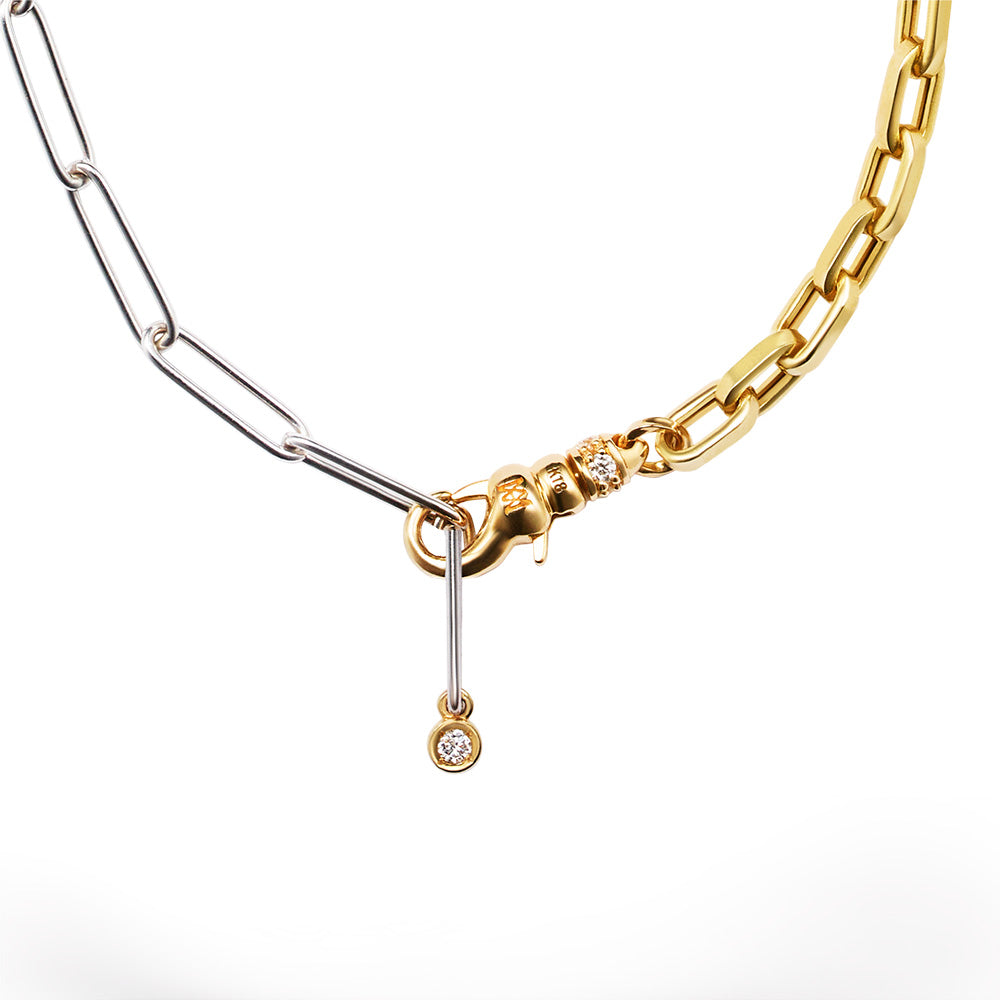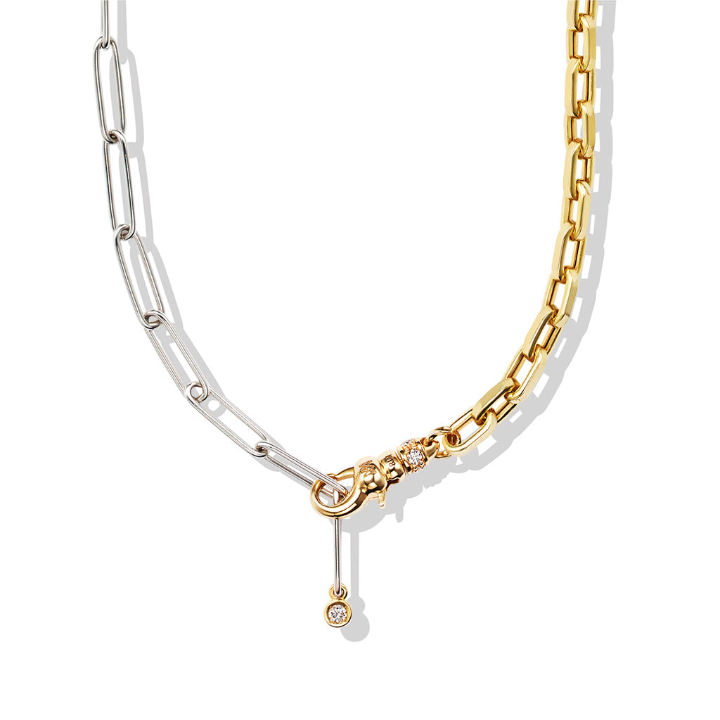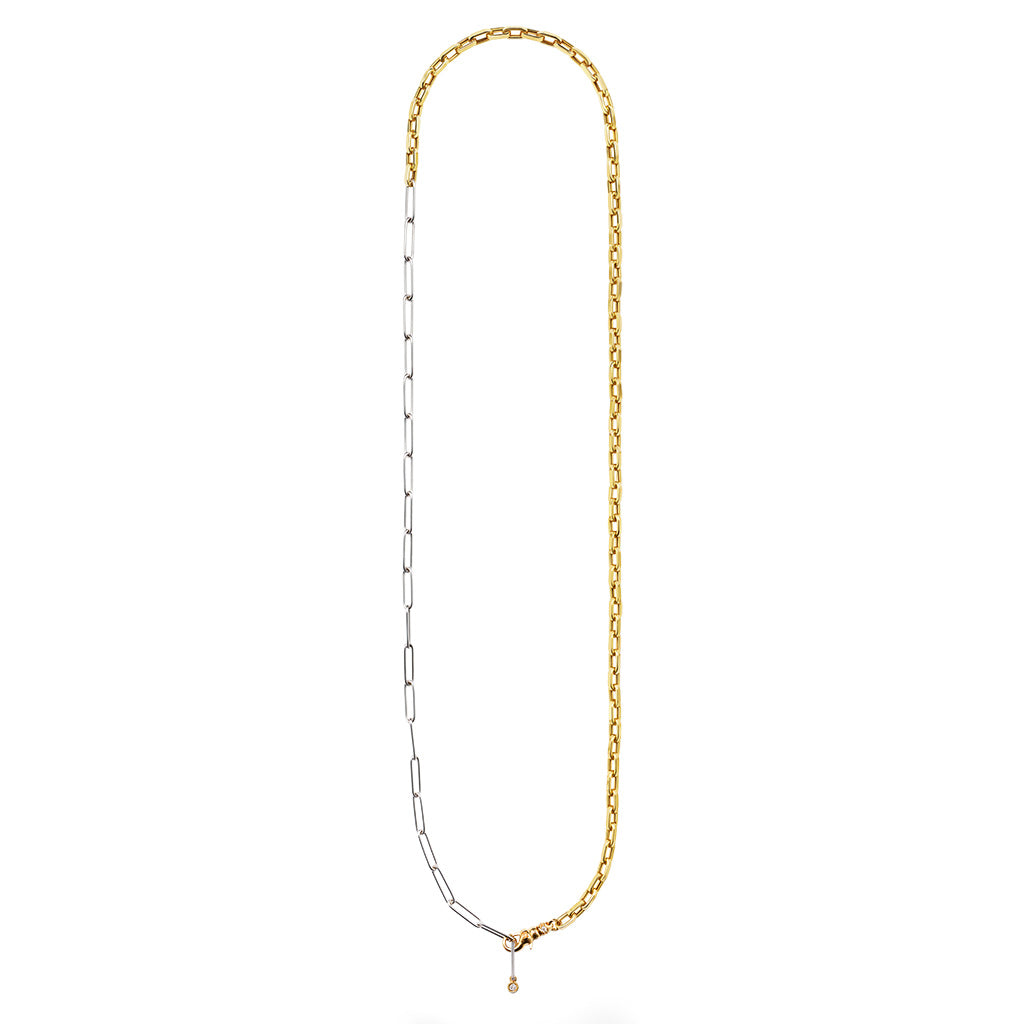 A versatile mix of 18K white gold paperclip chain and yellow gold anchor chain. A single diamond set in yellow gold accents the paperclip side, while the Milamore Pocket Watch Clasp allows for adjustable styling as a traditional chain or lariat.