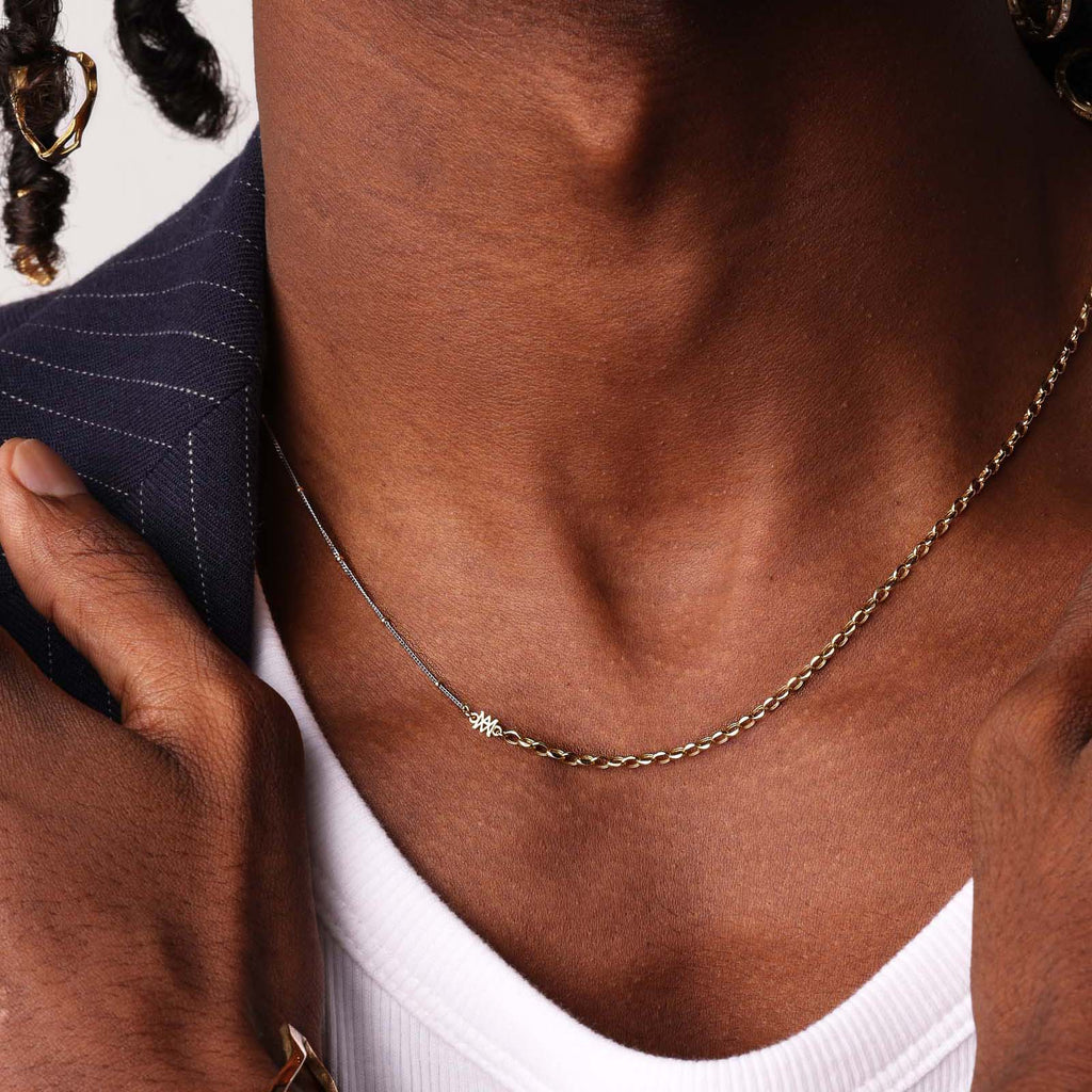 Duo Chain VII is our most delicate chain, combining a Japanese-made cable and satellite chain with the Milamore M emblem. Wear it as a second skin or layer it with Classic Duo Chain I or II for a bold contrast. A versatile piece to elevate any look.
