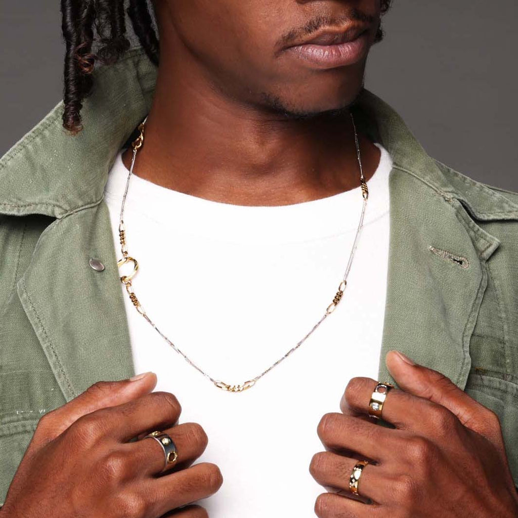 The Kintsugi Duo Chain Necklace contrasts bold yellow gold Cuban links with delicate white gold satellite chains. A Kintsugi-detailed clasp allows for charm customization.