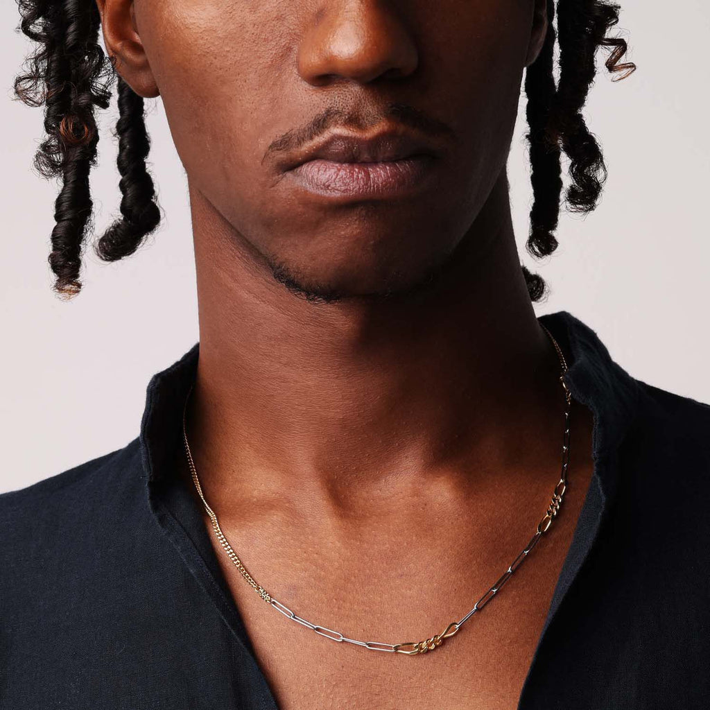 Duo Chain VI is an elevated take on our signature Duo Chain III, pairing a classic Cuban chain with our iconic paperclip and Figaro links for bold contrast. A single diamond at the end adds a touch of sparkle.