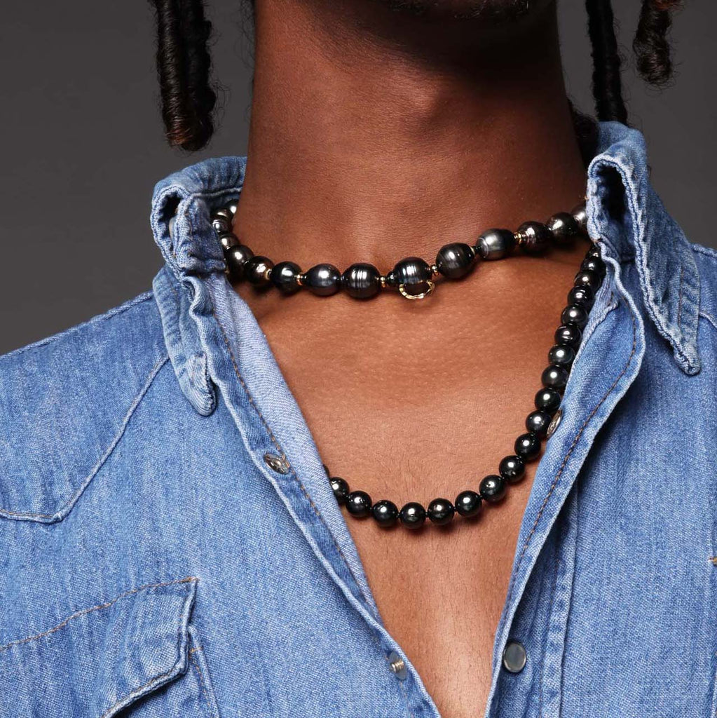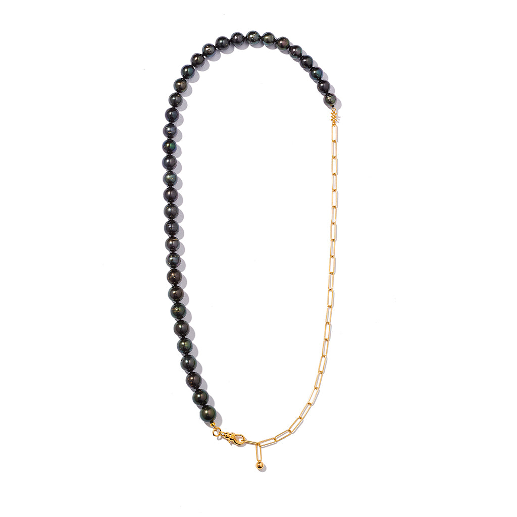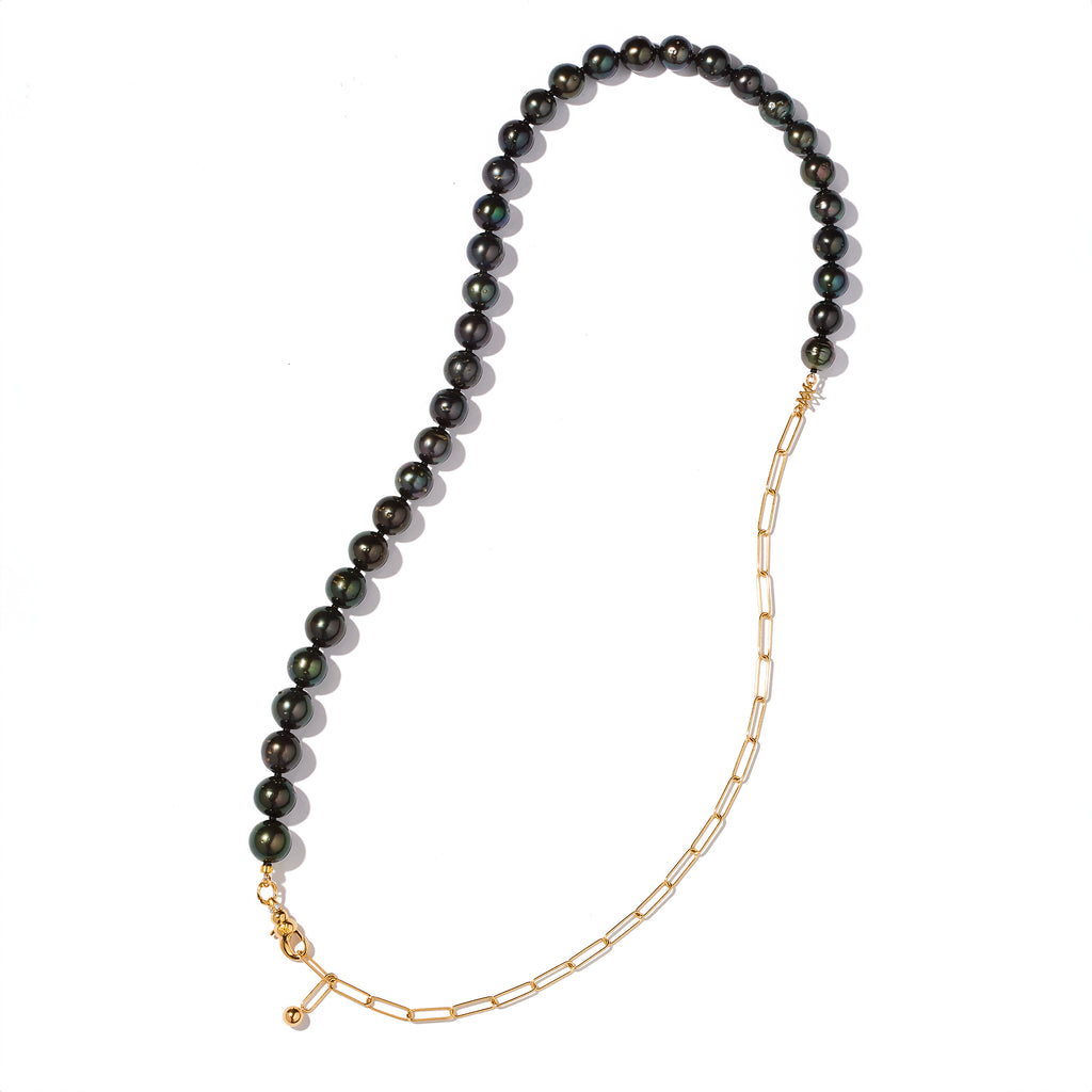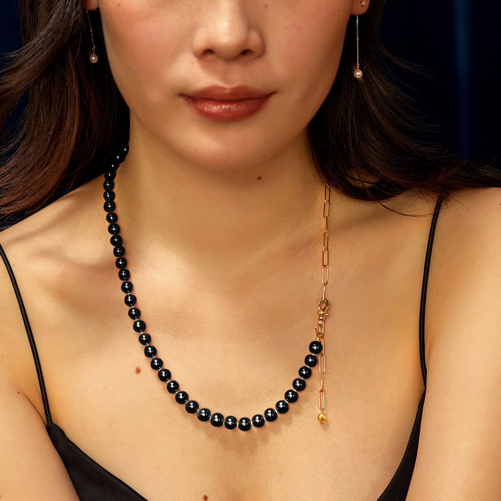 Classic Noir Pearl Duo Chain necklace is an edgy take on our classic pearl pieces. Featuring an 18kt gold ball at the end of a delicate paperclip chain and unique black Tahitian pearls that increase in size from 8mm to 10mm, finished with our signature Milamore lobster clasp for a blend of classic and contemporary charm.