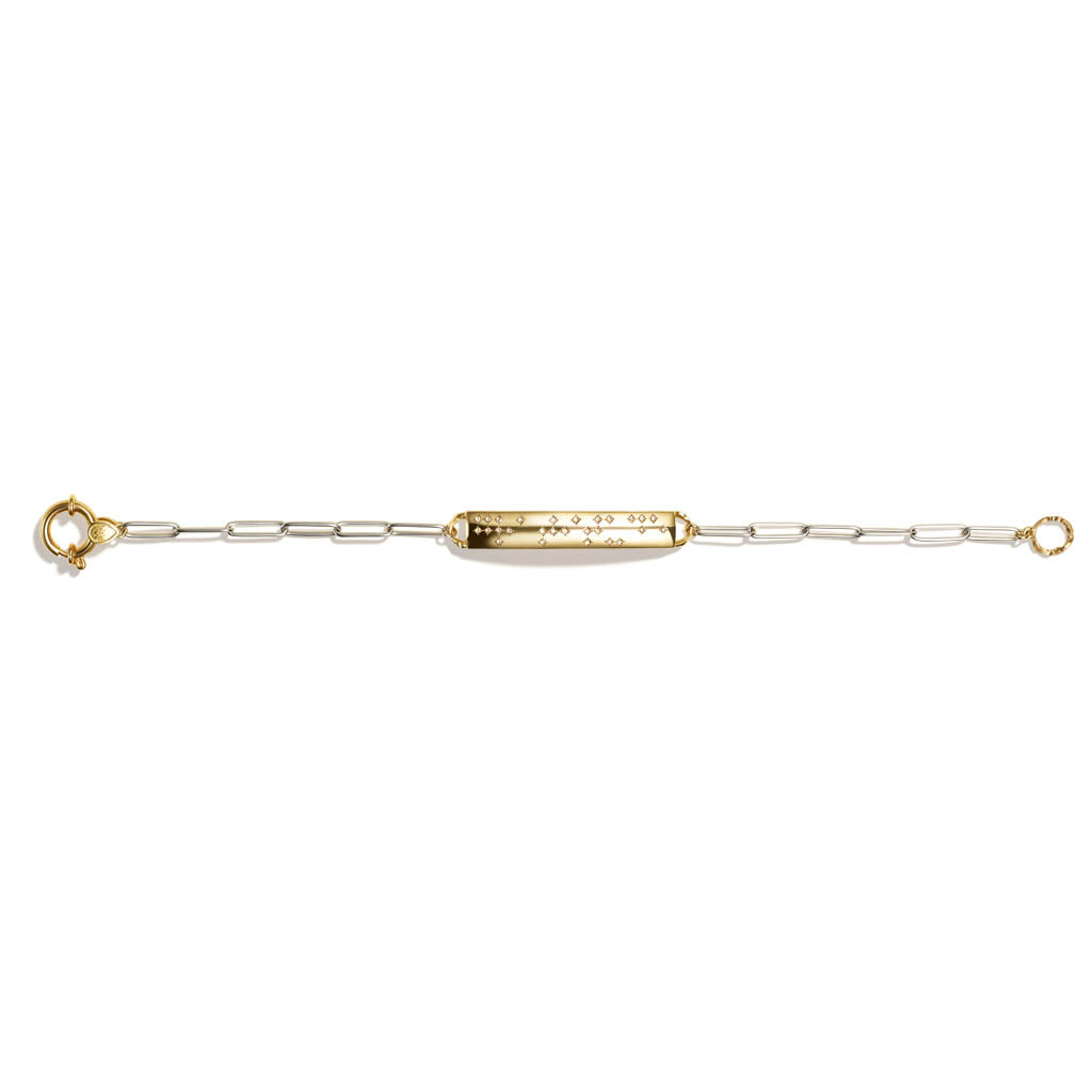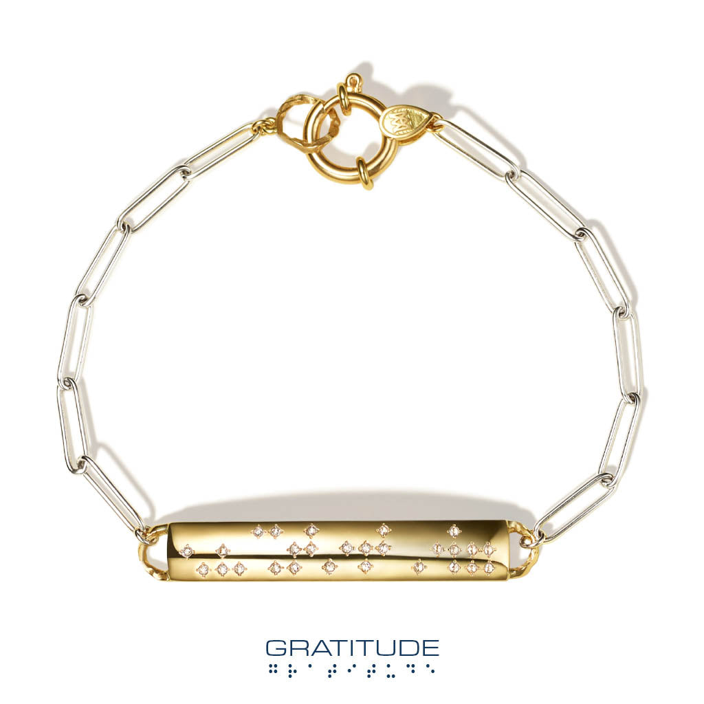This piece spells ‘Gratitude’ in Braille, written in diamonds on solid 18K yellow gold. Suspended from an 18K white gold paperclip chain and secured with our signature pocket-watch clasp, it offers a timeless design and a subtle way to express what matters most.