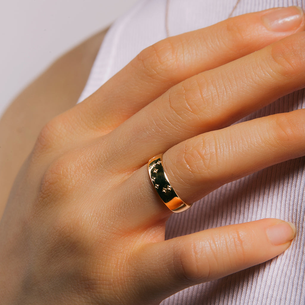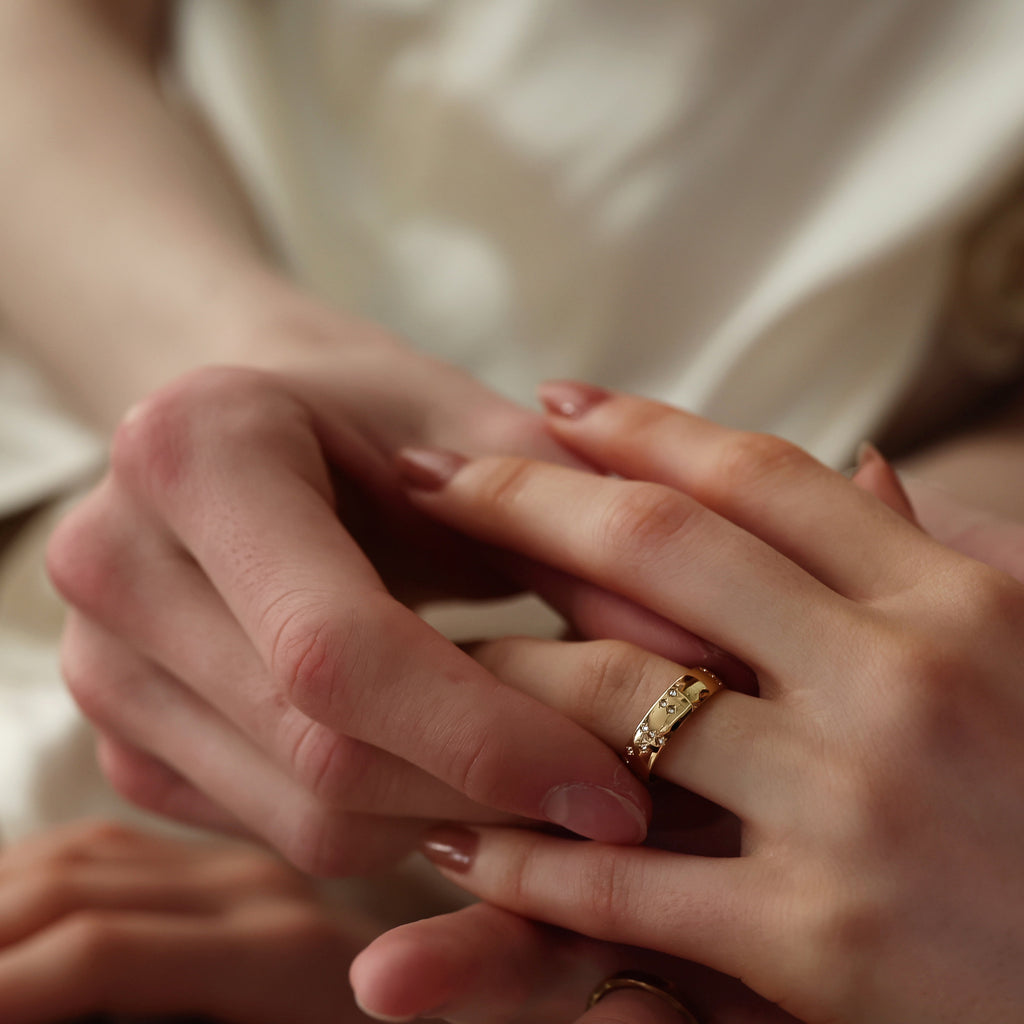 A modern gold band featuring “Manifest” in Braille with discreetly set diamonds. Designed for both visual and tactile recognition, it carries a subtle, meaningful message.