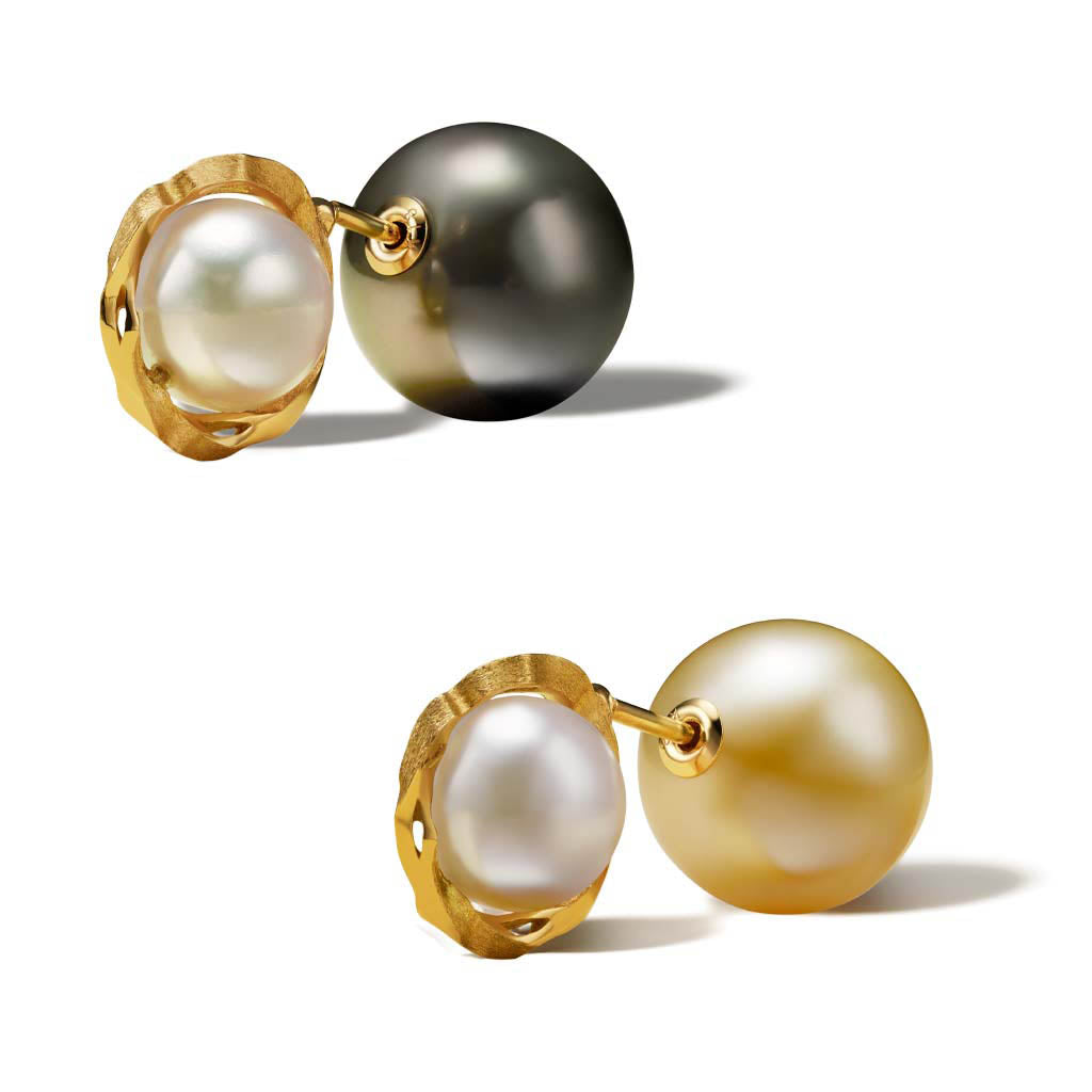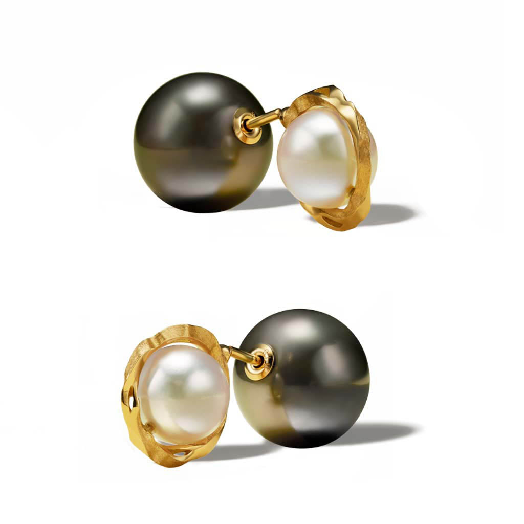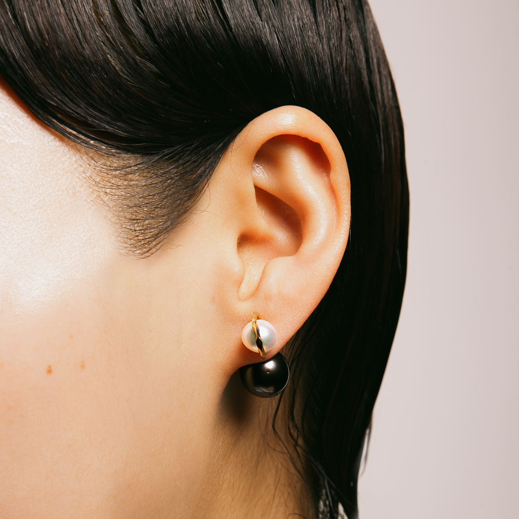 the Kintsugi Duo Pearl Earring blends a white Akoya pearl with unique 18kt gold Kintsugi detailing. Choose between a gold or black South Sea Pearl to complement its elegant design, ideal for lending sophistication to any look.