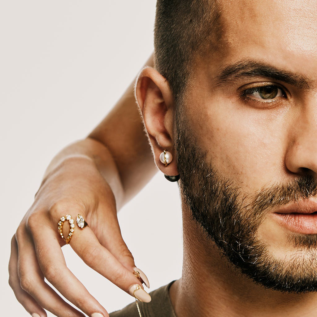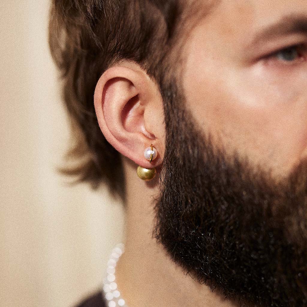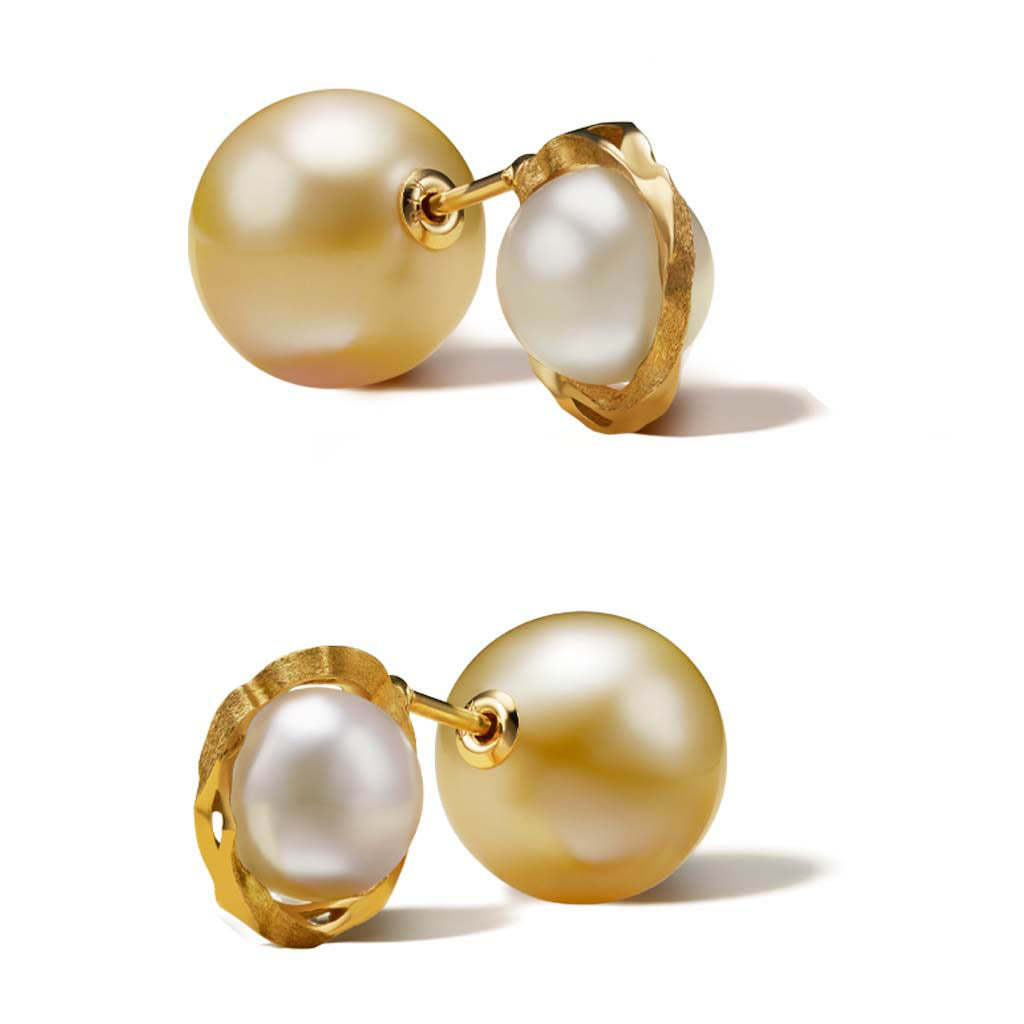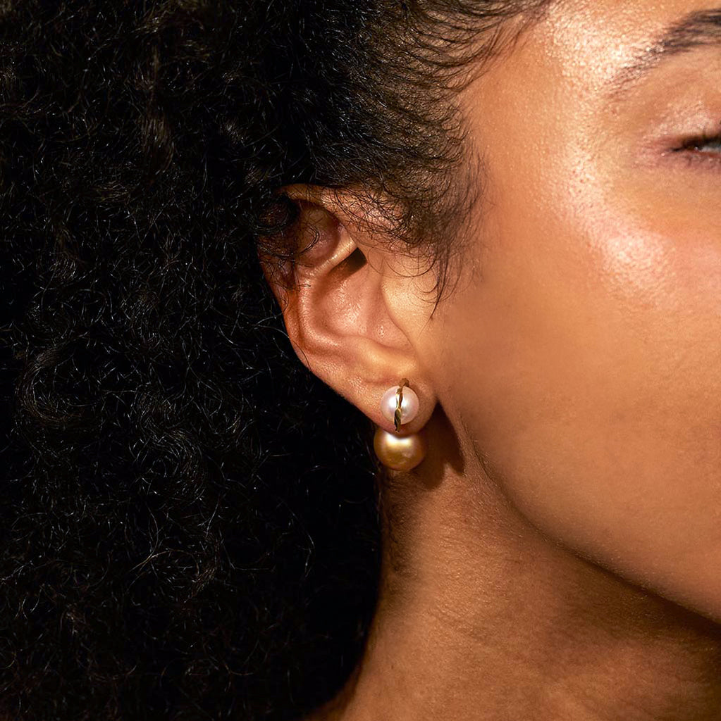 the Kintsugi Duo Pearl Earring blends a white Akoya pearl with unique 18kt gold Kintsugi detailing. Choose between a gold or black South Sea Pearl to complement its elegant design, ideal for lending sophistication to any look.