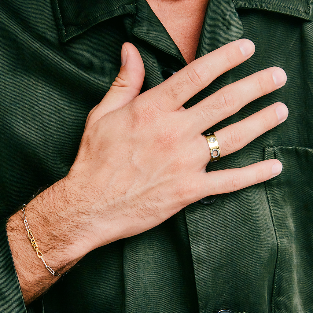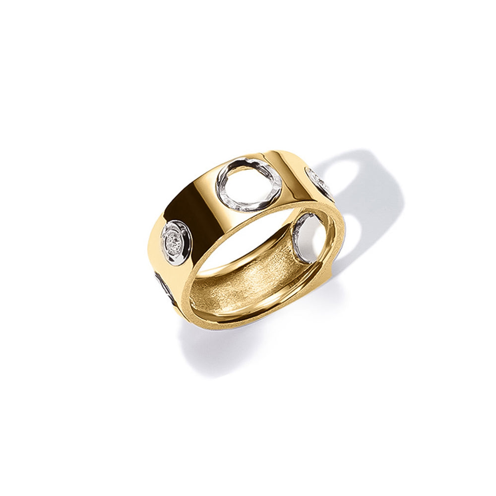 An 18K yellow gold band with platinum900 detailing, featuring our signature Kintsugi "En," which means eternity in Japanese. This ring combines matte and polished finishes with a single round-cut natural diamond