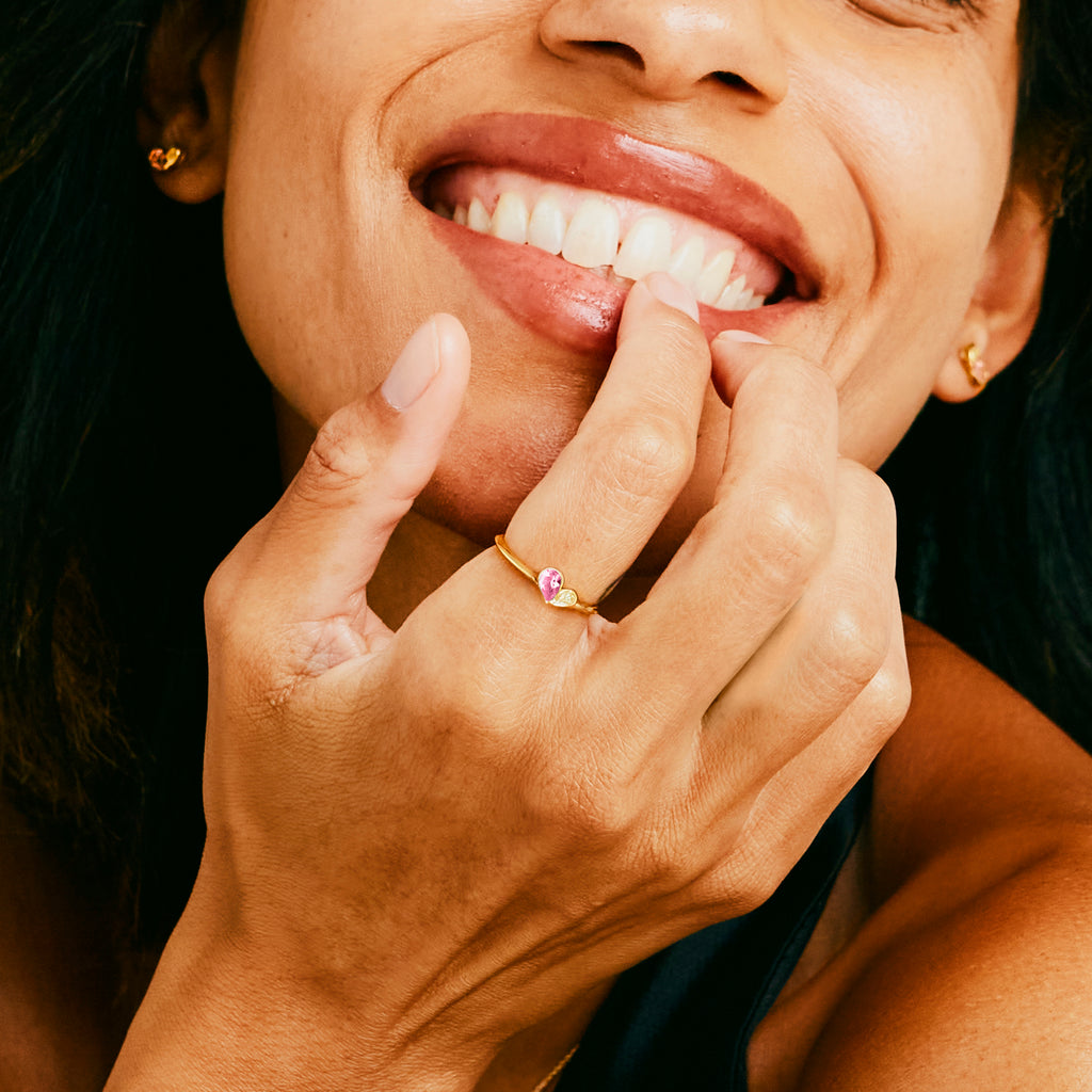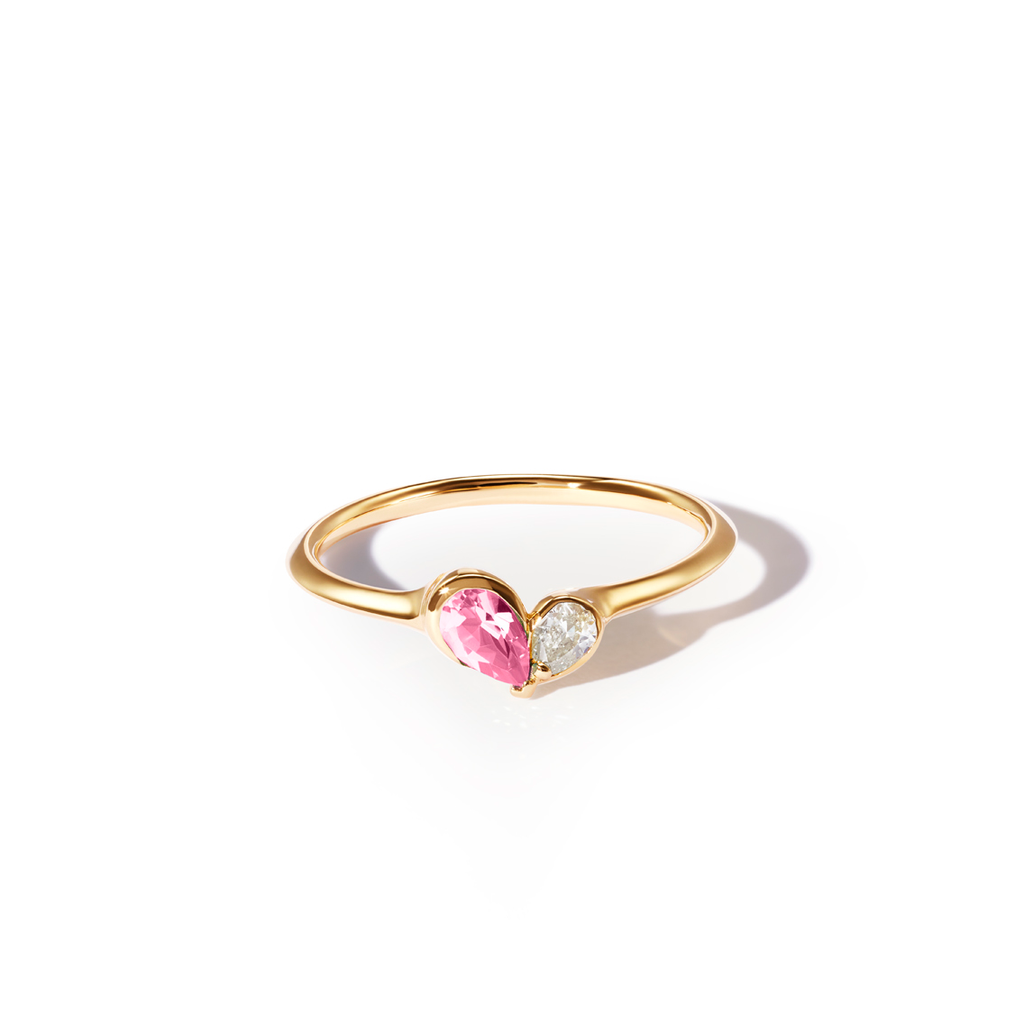 A modern take on the Toi-et-Moi setting. Two pear-shaped stones (Pink Tourmaline & Diamond) arranged in an asymmetrical heart shape, set on a thin 18kt gold knife-edge band. Celebrating the unique nature of love