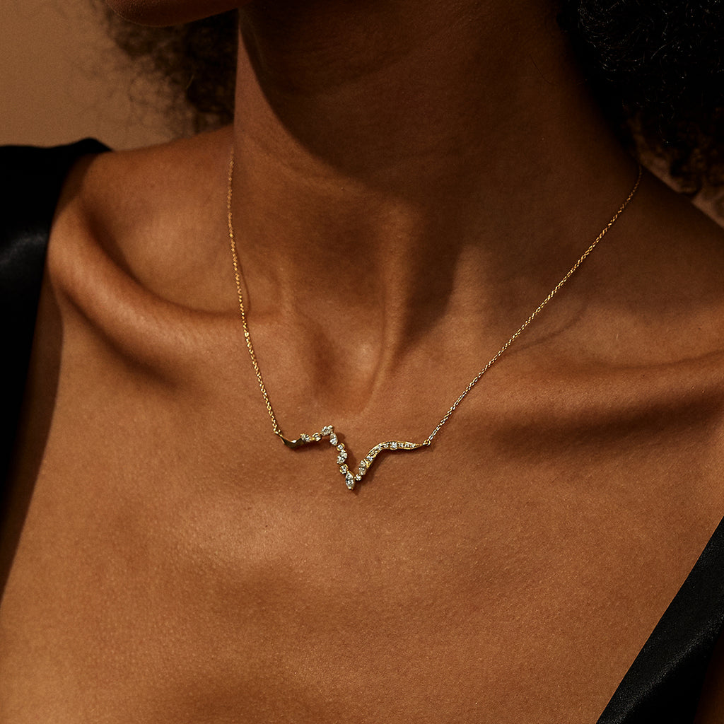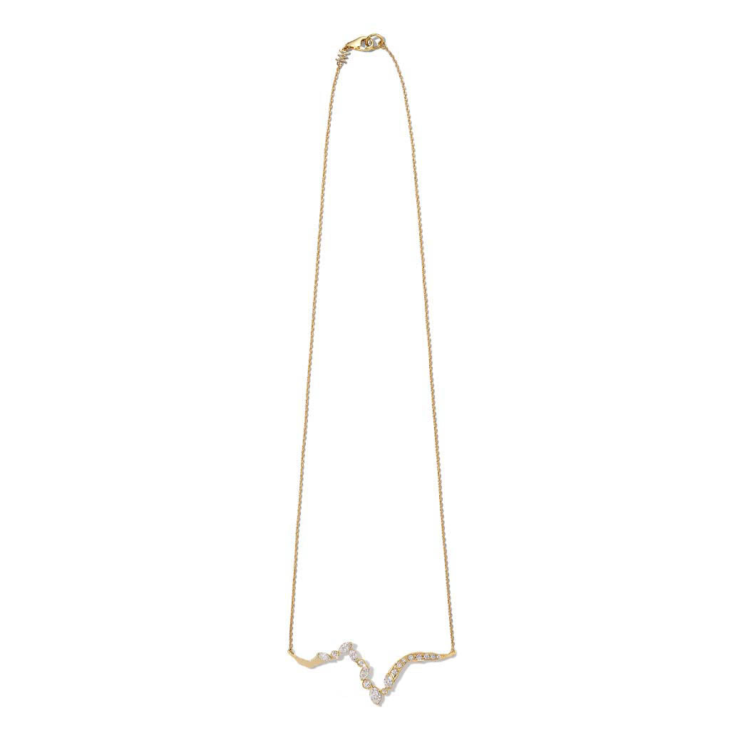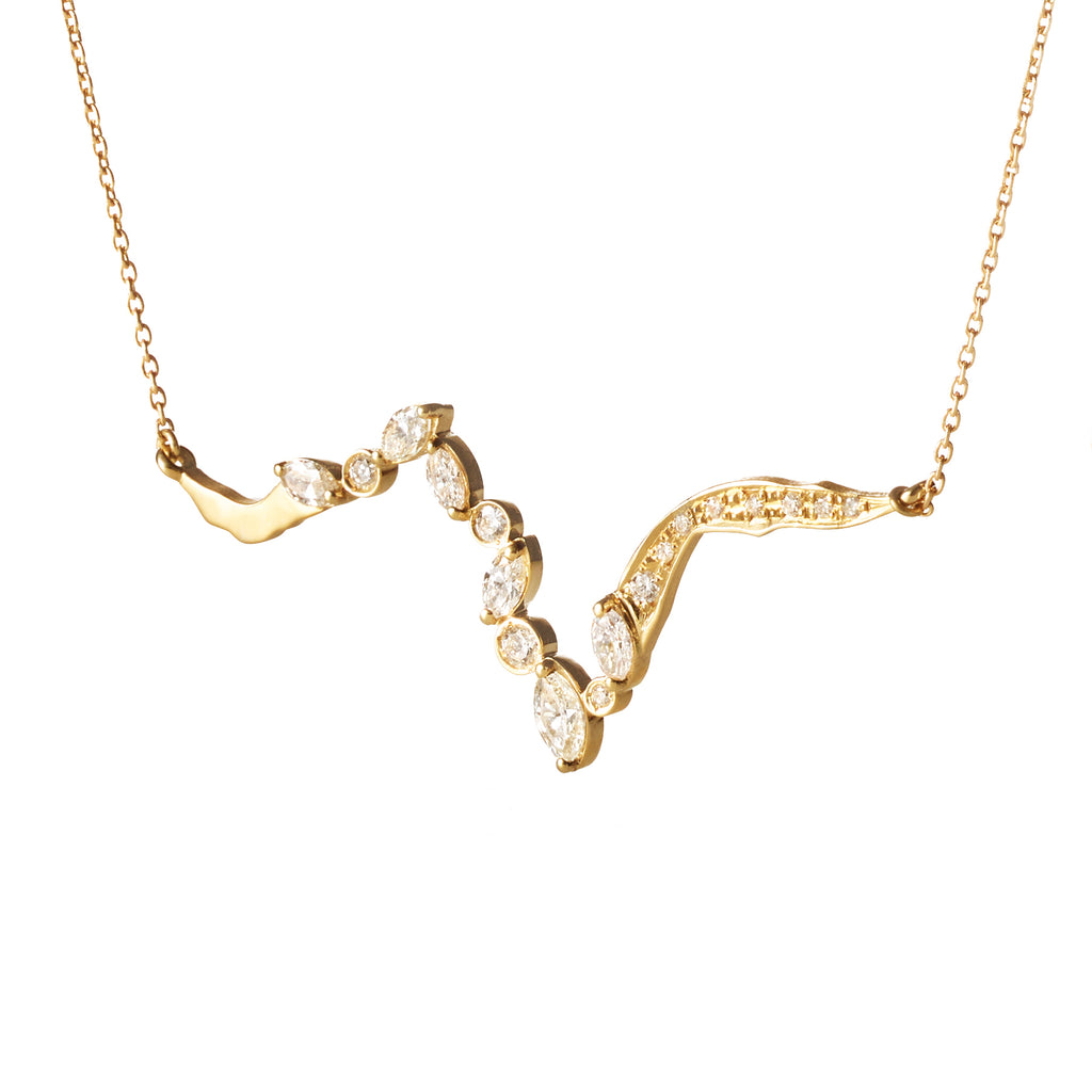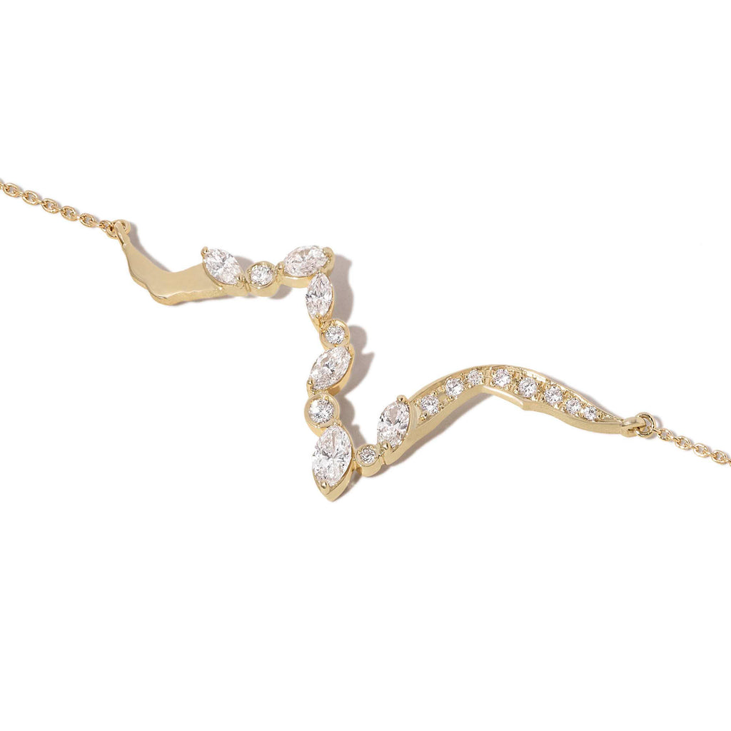Reminiscent of Kintsugi cracks, natural marquise and round-cut diamonds flow along the design. Designed to sit between the collarbones, conceptually mending the wearer.