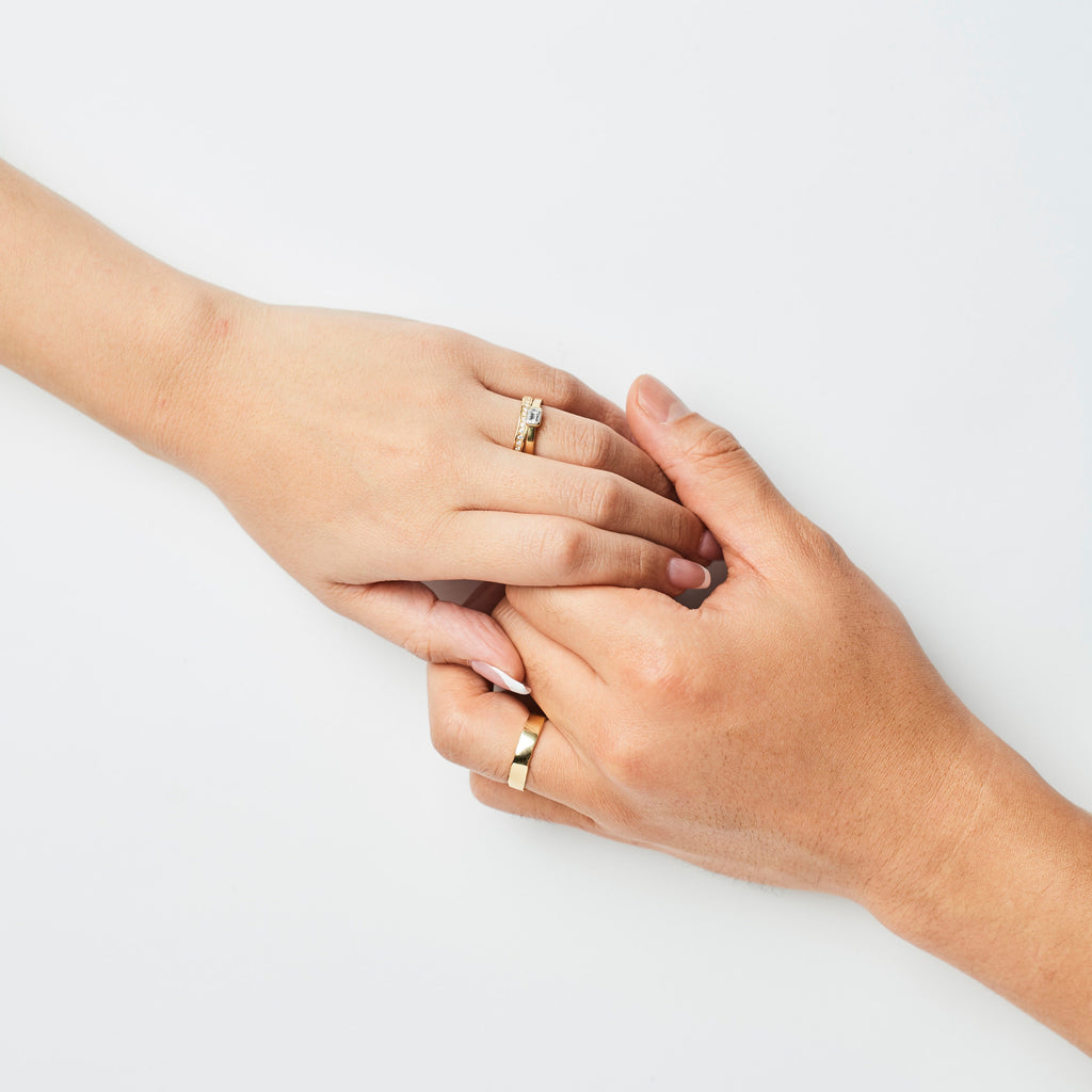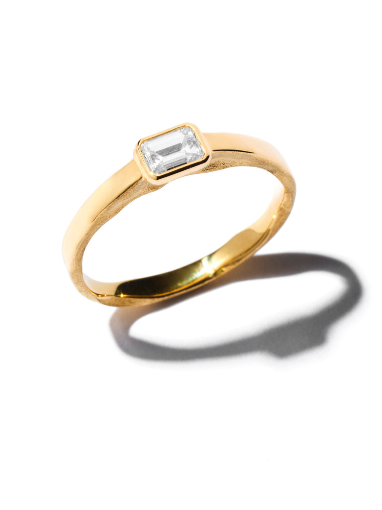 A classic design featuring a rectangular diamond, set on an 18K yellow gold band with a subtle Kintsugi-inspired texture along the side. Handcrafted by Japanese artisans—a timeless symbol of enduring love.”