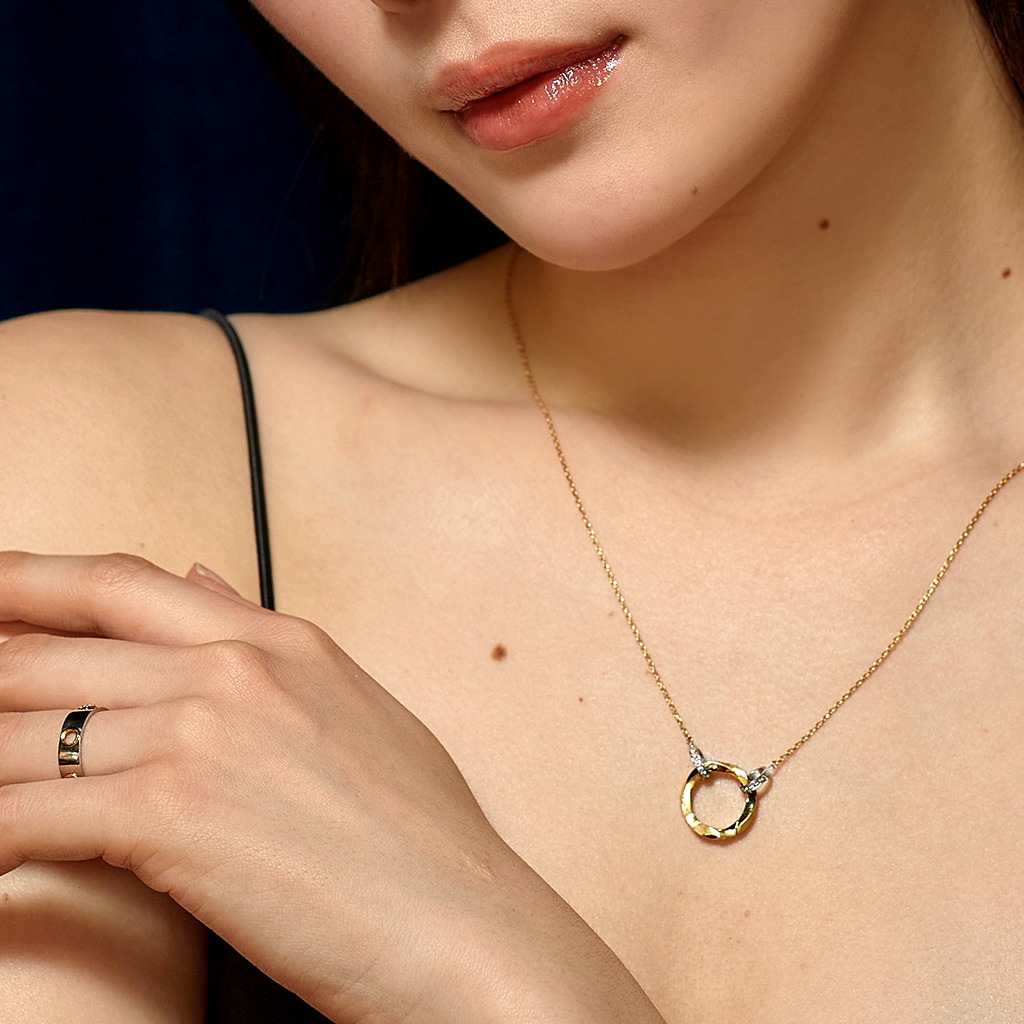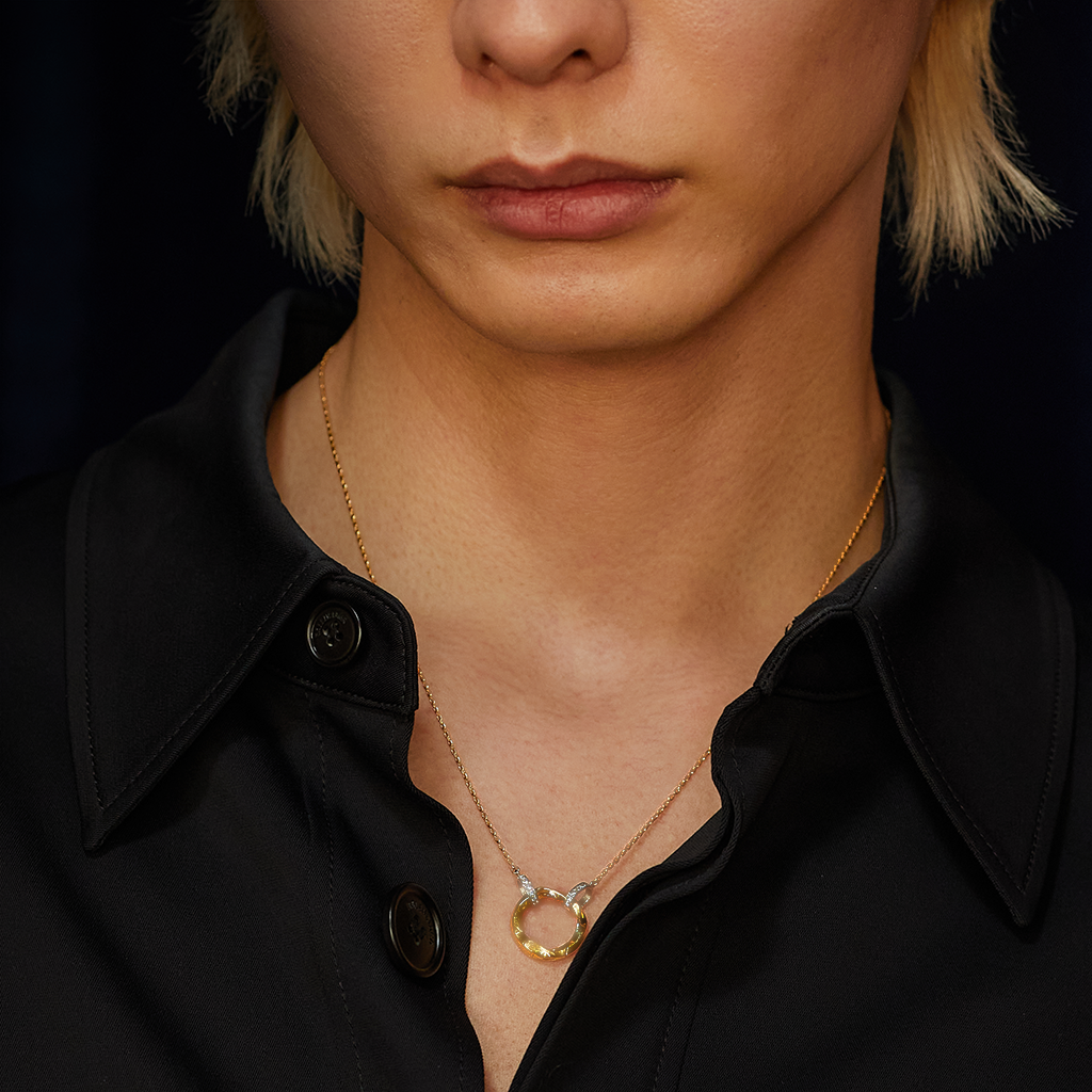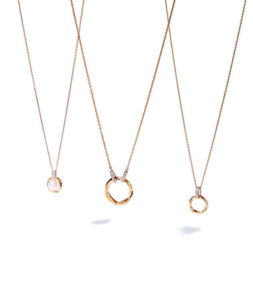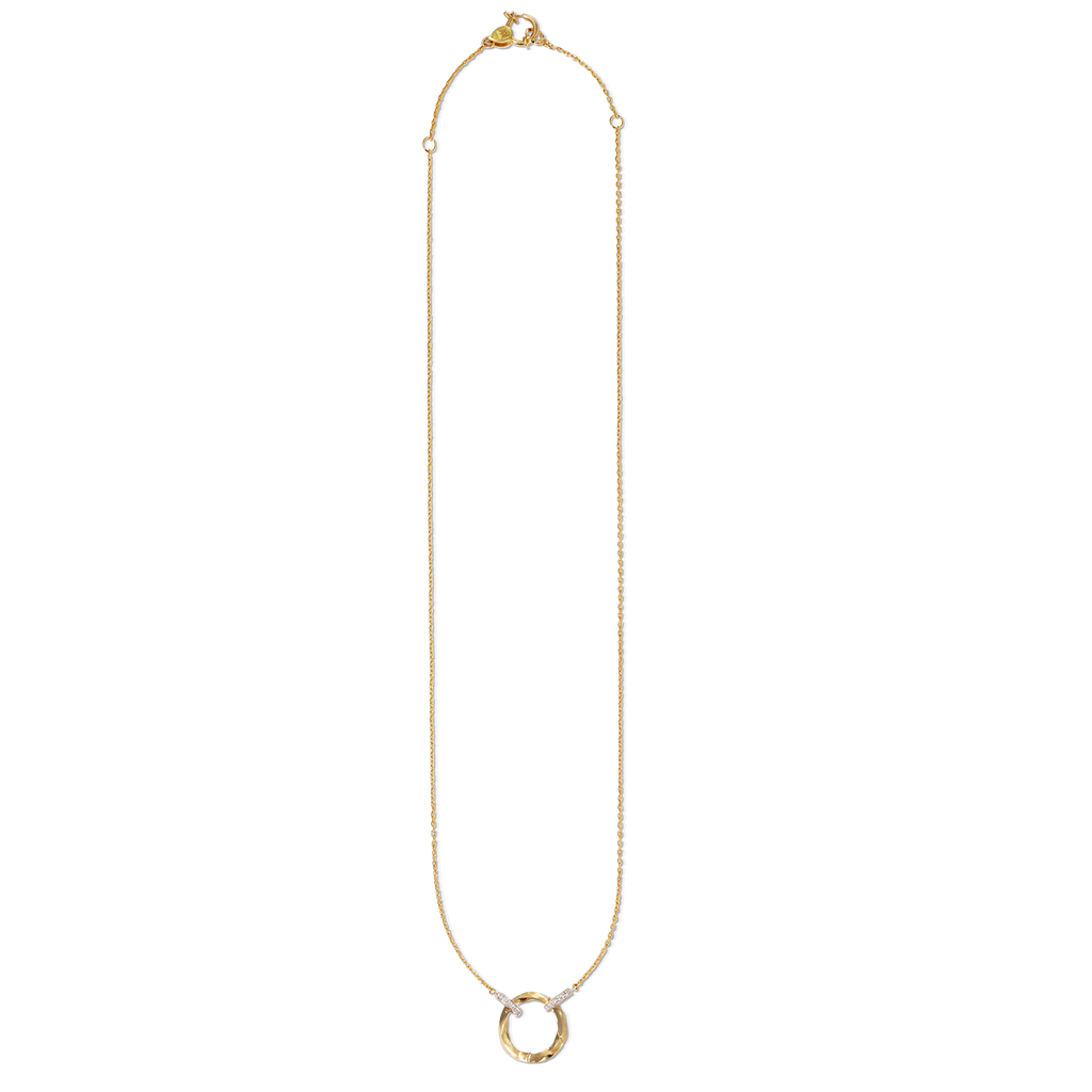 Our En open pendant features a stunning circle design with Kintsugi details. The circle is suspended by diamonds and can be opened to add your personal charm or one of our original designed charms. This versatile pendant is the perfect statement piece that blends elegance and strength, just like the philosophy of Kintsugi.