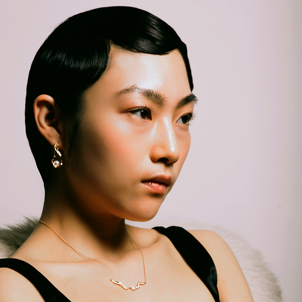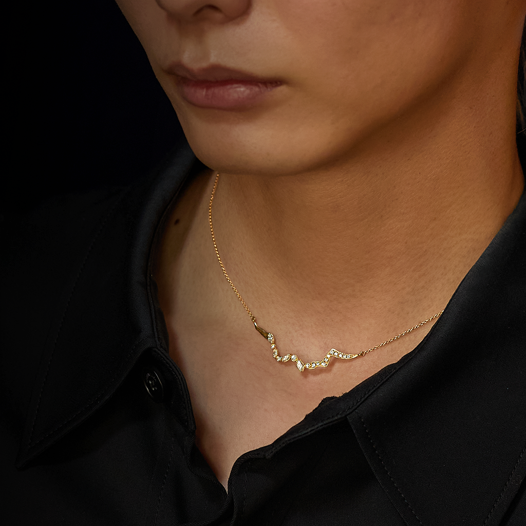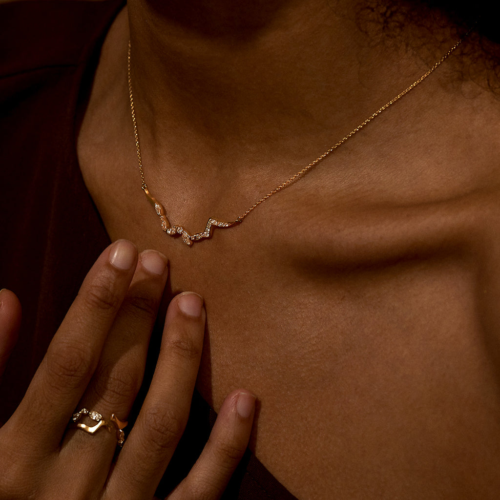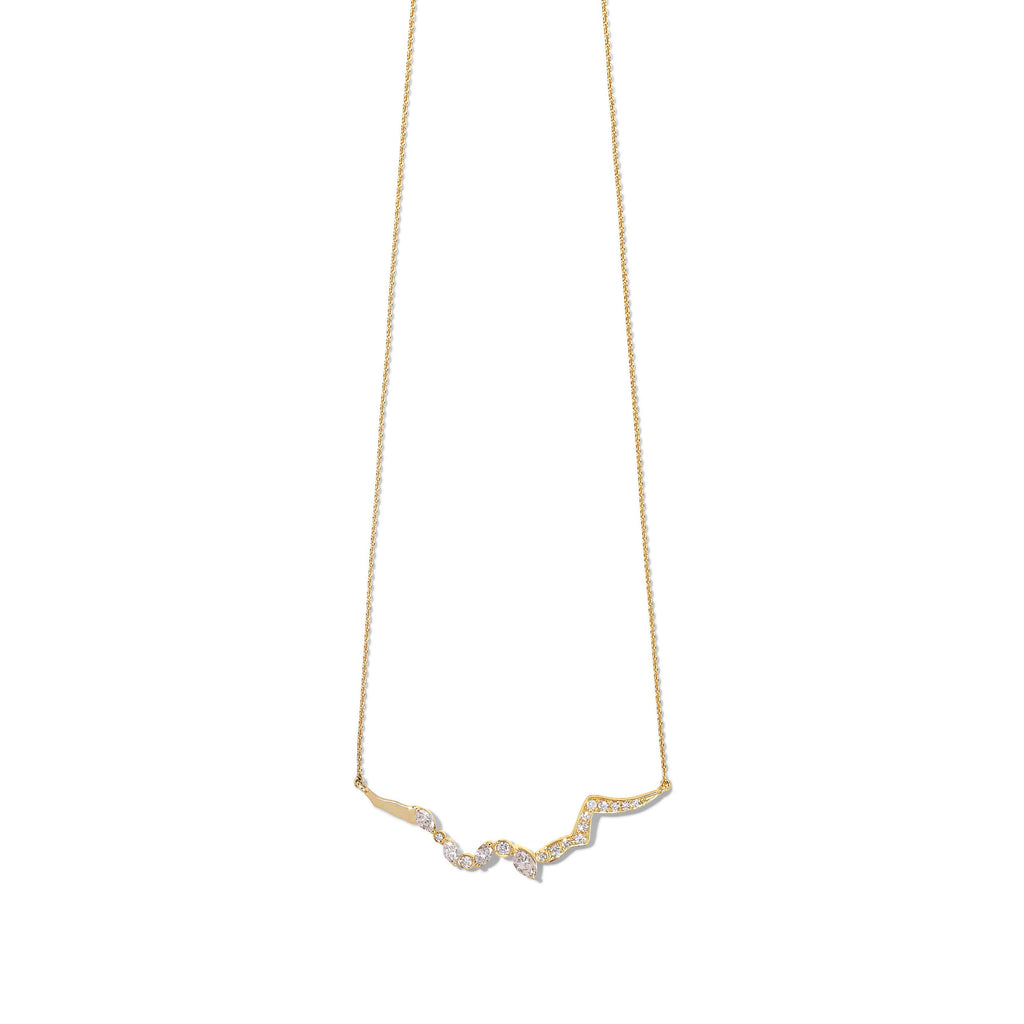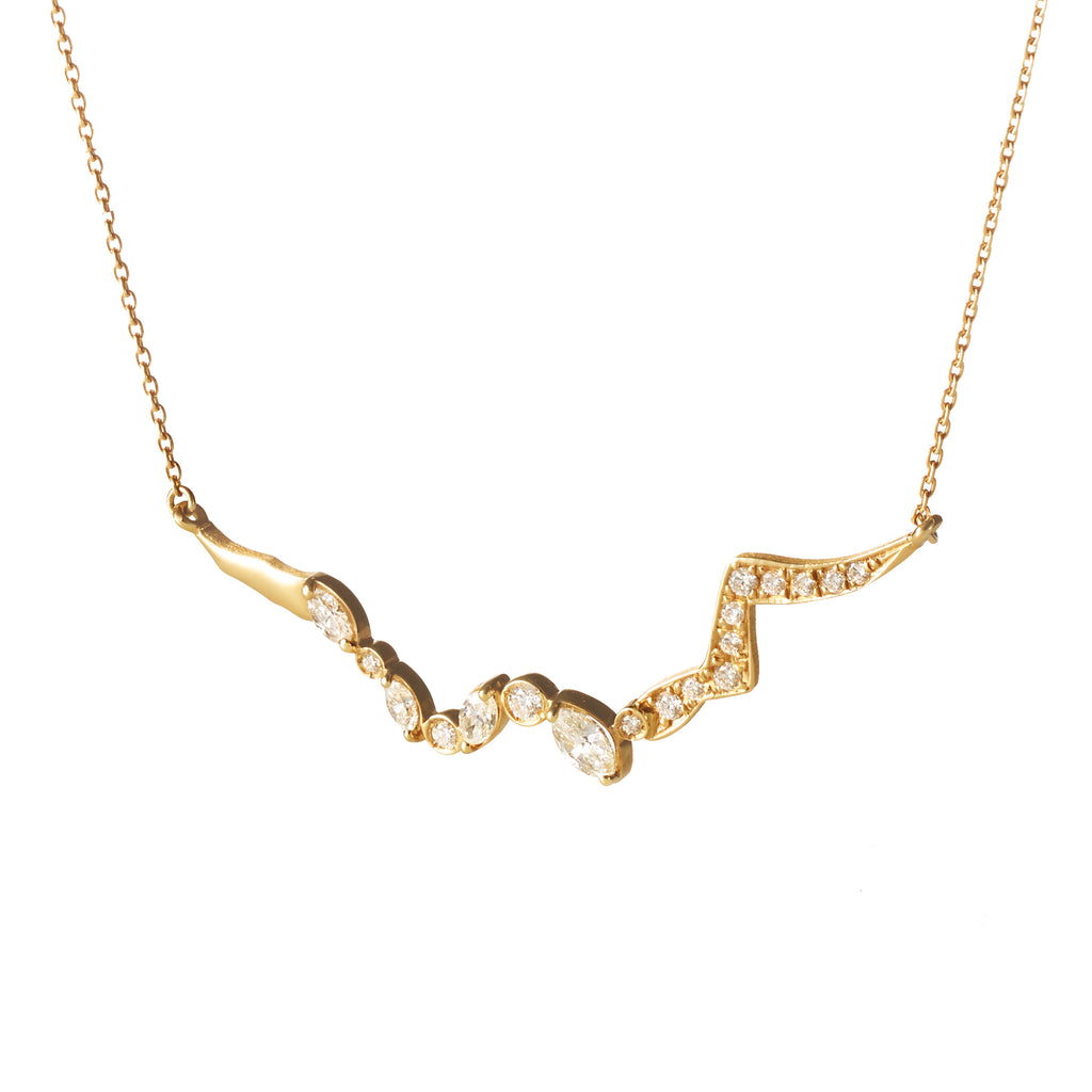 Reminiscent of Kintsugi cracks, natural marquise and round-cut diamonds flow along the design. Designed to sit between the collarbones, conceptually mending the wearer.