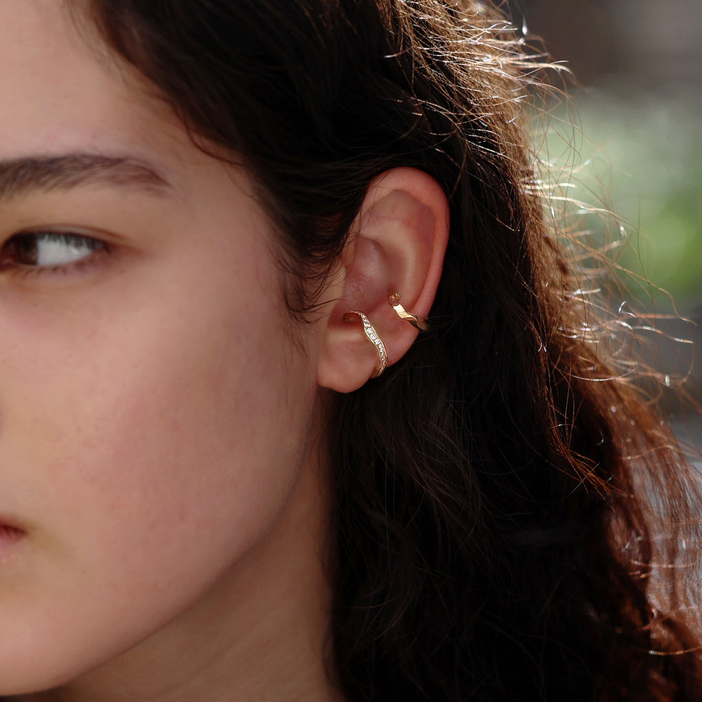 The classic Kintsugi Pavé Vine Ring, reimagined as an ear cuff. Natural diamonds bring a subtle shimmer, enhancing the beauty of your ear. A Japanese-designed hinge ensures a secure, comfortable fit.