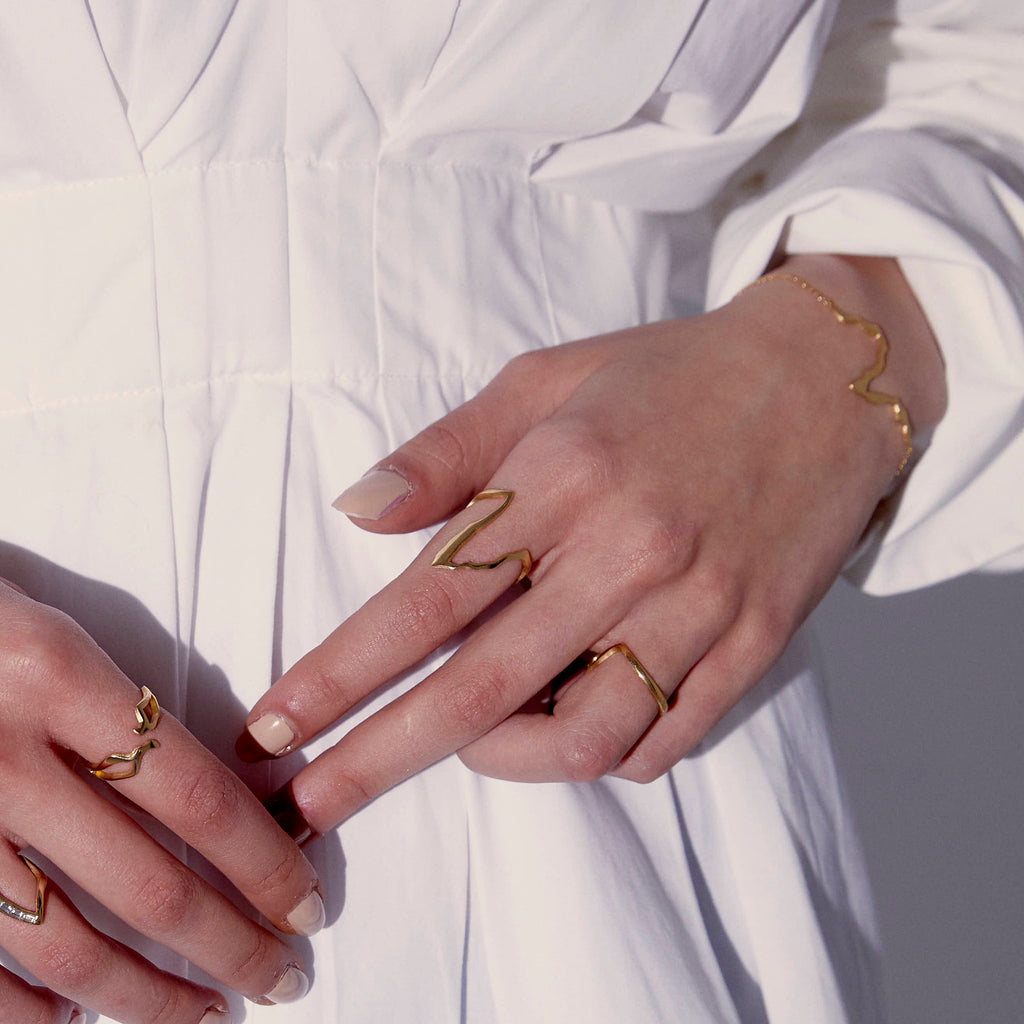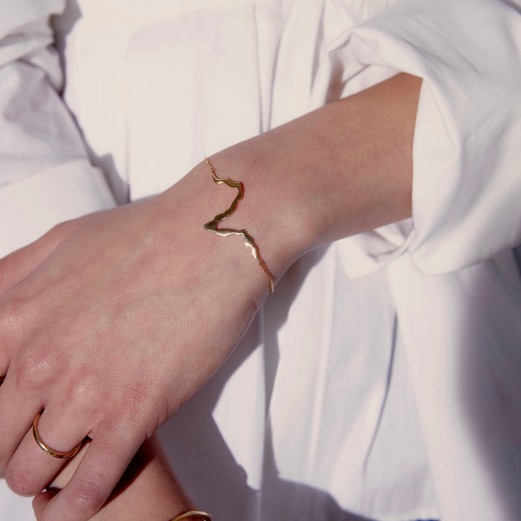 The Kintsugi Victoria Bracelet is a contemporary take on a classic design, characterized by abstract lines and elegant matte and polished gold finishes. This bracelet is a symbol of transformation and repair, much like the Kintsugi technique itself, which uses gold to bind broken pieces of ceramic back together.